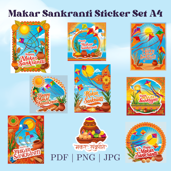 Makar Sankranti Printable Stickers – Digital Download, A4 Size (JPEG, PNG, PDF)