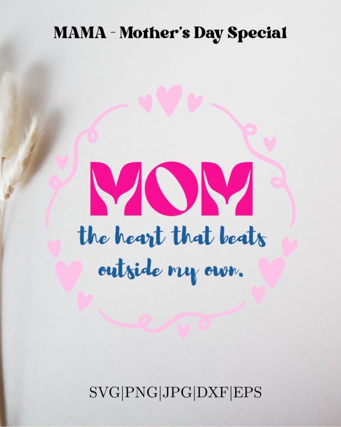 Celebrate a mother’s love with this touching quote design: “MOM – the heart that beats outside me,” framed in a heart wreath. Includes SVG, PNG, JPG, DXF, and EPS files for crafting and gifts.